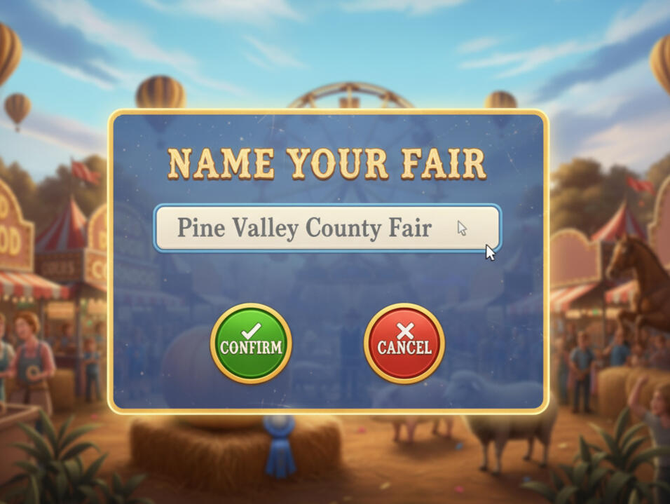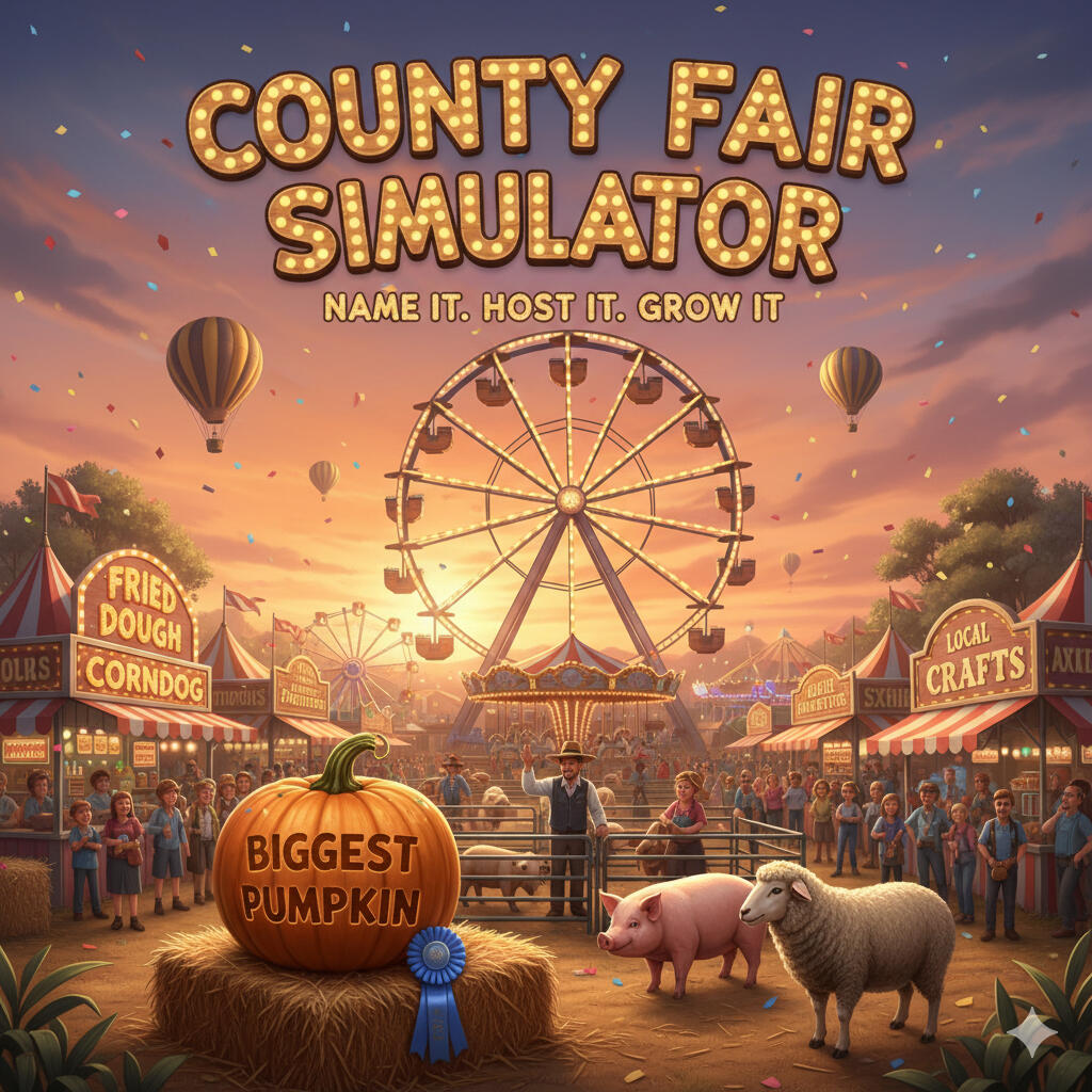 NAME AND HOST YOUR OWN COUNTY FAIR in COUNTY FAIR SIMULATOR (Coming Soon to Steam). In this unique simulator experience, you run your own county fair and get to know the many memorable folks in your humble town.Choose what activities to hold, what to invite, what rides to have and the prices for everything as you make sure every day of the month-long fair is an enjoyable experience for all!